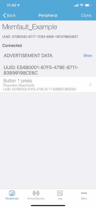 The previous screen also verifies that the Simple Service was discovered correctly and it contains our Button 1 Characteristic.